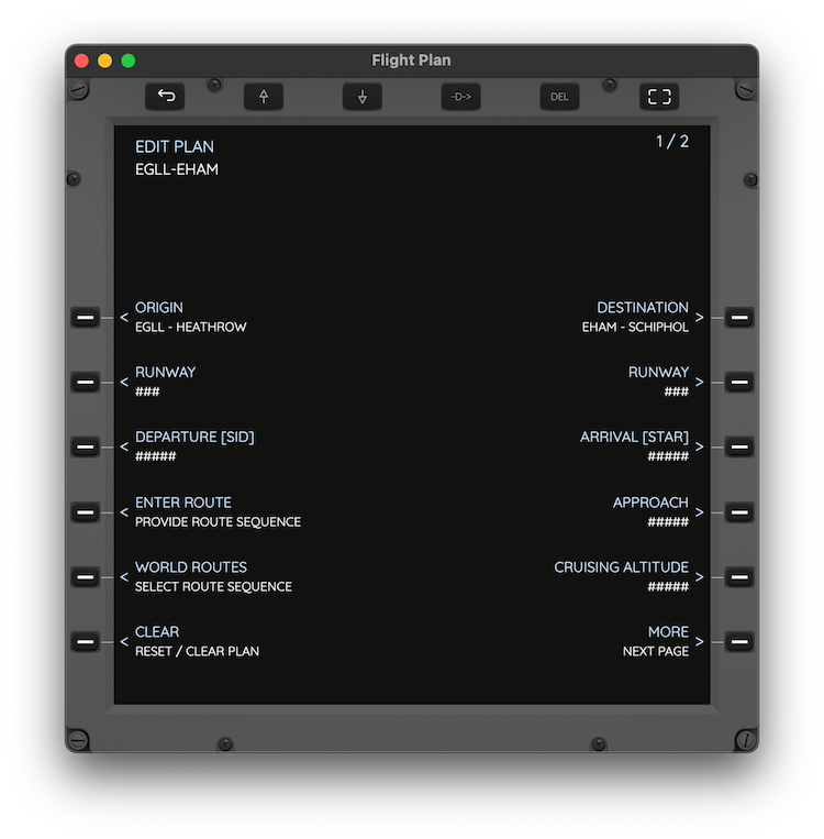 The Plan EditorWhen creating a flight plan, the first thing to enter are the origin and destination airports. Based on these a list of options is given in order to select things such as departure and arrival runways, departure and arrival procedures, enter a route including airways and defining a vertical profile with a crusing altitude. The options given at each stage depend on the AIRAC in use and the facilities that each airport contains.
