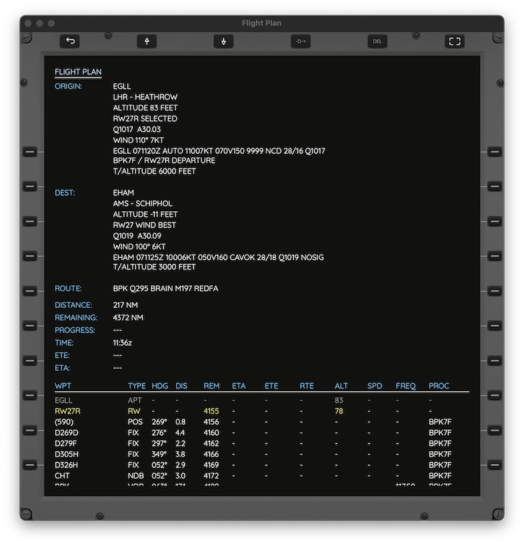 View the Flight PlanPlan View mode allows the examination of a plan, displaying details about its origin and destination, together with require paramenters, estimated times and distances. Things such as current weather conditions are also displayed in order to allow for better runway and procedure selection decisions. Following this, Plan View mode which is a (scrollable view) also shows details and statistics about each of the points comprising the route; per leg headings, distances, times, frequencies and procedures are some of the data made available per leg. |