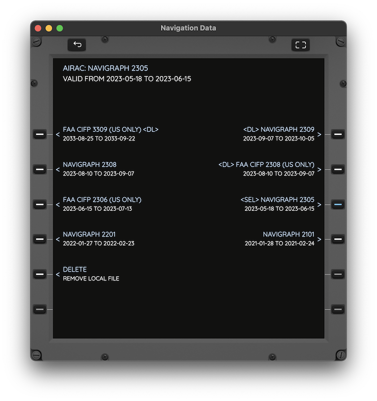AirTrack comes with a built-in navigation data set called an AIRAC. The data is significantly old and out of date, courtesy of Navigraph. It's good for basic flight but if you fly online in networks such as VATSIM or IVAO, you may need a more up to date AIRAC. There is the possibility of subscribing / logging into Navigraph at their web site for the latest cycle, or to subscribe US centric FAA CIFP from within the app. In either case, the Nav Data page allows the selection and download of data sets or AIRACS. This data objects are then used throughout the app for flight planning, radio navigation and all other intents and purposes.