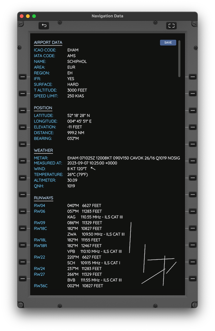 Each nav data point type can be queried and shown its associated data. Airports are an extremely complete type in that they they include information about the airfield such as name, codes, transition altitudes, position, current weather, available runways, localizers, relative runway orientation, ATC frequencies, and the list of procedures of SID, STAR and Approach types. The following image depicts part of an airport's details page: