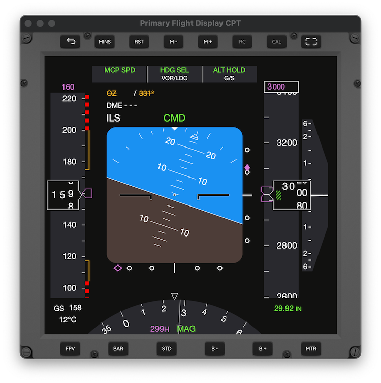 EFIS ButtonsThe AirTrack PFD comes with a set of EFIS buttons which are based on part of the EFIS panel found on Boeing 737 NG planes. They allow controlling things such as the altimeter/qnh, decision height variables and selecting metres display. AirTrack comes with 3 distinct PFD/EFIS types, representing the captain/left side PFD/EFIS of the plane, the first officer/right side PFD/EFIS set, and a third which contains standalone EFIS settings so multiple panels can be spawn each with its set of parameters.